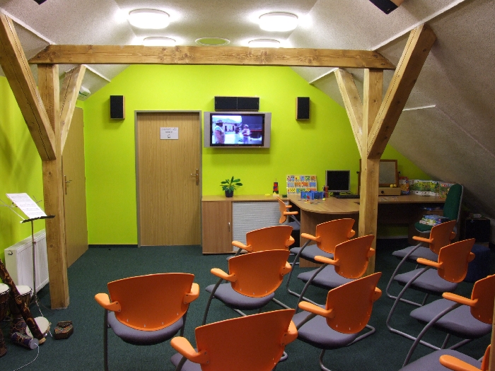 Centrum zahrnuje dvě místnosti předělené mobilní stěnou a příslušenství v podobě skladovacích prostor, sociálního zázemí, vč. kabinetu a kuchyňky. Prostory jsou materiálně a technicky vybaveny pro provozování centra muzikotarapie, centra rozvoje smyslového vnímání a pro logopedii.